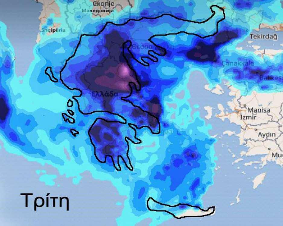 Από την Τρίτη και στη συνέχεια η κακοκαιρία θα αποκτήσει σχεδόν γενικευμένο χαρακτήρα με πτώση της θερμοκρασίας για τις περισσότερες περιοχές της χώρας αλλά και βροχές που κατά τόπους ενδέχεται να είναι πολύ ισχυρές. (βλ. χάρτη 2ο, 3ο, 4ο). Η θερμοκρασία σε αρκετές κυρίως ηπειρωτικές περιοχές της χώρας θα σημειώσει πτώση ακόμη και 7-8 βαθμούς κελσίου σε σχέση με τις προηγούμενες ημέρες ενώ οι άνεμοι φαίνεται ότι δεν θα προβληματίσουν, με εξαίρεση μόνο το βόρειο Αιγαίο όπου την Τρίτη θα πνέουν βορειοανατολικοί άνεμοι 6-7 και τοπικά ακόμη και 8 μποφόρ.