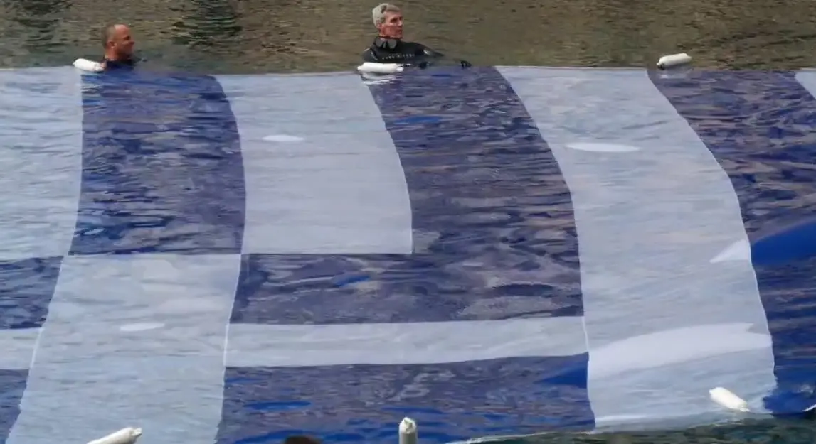 Στις 12:00 ακριβώς, στον Όρμο της Αφροδίτης (το γνωστό «Μπαϊκούτσι»), μέλη του Συνδέσμου Ελλήνων Βατραχανθρώπων βούτηξαν στα νερά για να απλώσουν μια τεράστια ελληνική σημαία στην επιφάνεια της θάλασσας.