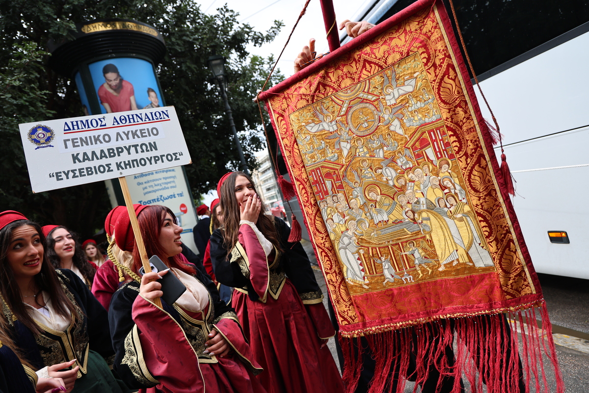 Συνοδεία της φιλαρμονικής του Δήμου Αθηναίων, παρελαύνουν αντιπροσωπευτικά τμήματα μαθητών και μαθητριών όλων των σχολείων του Δήμου Αθηναίων, με τον σημαιοφόρο και πέντε παραστάτες το κάθε ένα, ενώ την παρέλαση «άνοιξε» το Γενικό Λύκειο Καλαβρύτων, «Ευσέβιος Κυπουργός».