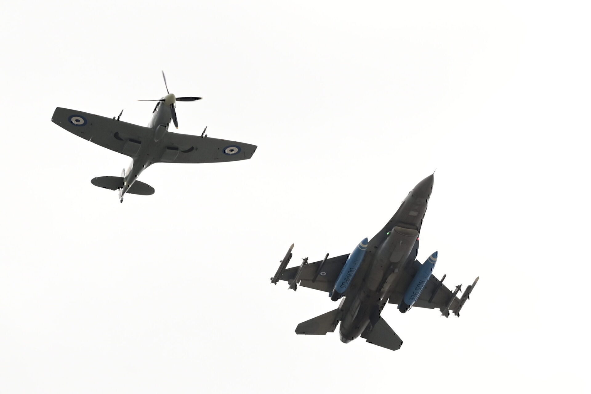 Το θρυλικό Spitfire έκανε επετειακή πτήση πάνω από την Αθήνα, συνοδευόμενο από ένα μαχητικό αεροσκάφος F-16