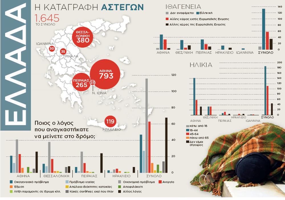 Η έρευνα που πραγματοποιήθηκε υπό την εποπτεία του υπουργείου Εργασίας σε συνεργασία με το Πάντειο Πανεπιστήμιο στους Δήμους Αθήνας, Θεσσαλονίκης, Πειραιά, Ηρακλείου, Νέας Ιωνίας, Ιωαννίνων και Τρικαίων κατέγραψε συνολικά 1.645 άστεγους, 691 στο δρόμο και 954 σε δομές. Οι 793 βρίσκονται στην Αθήνα, εκ των οποίων οι 353 κοιμούνται στα παγκάκια και οι 440 σε δομές.