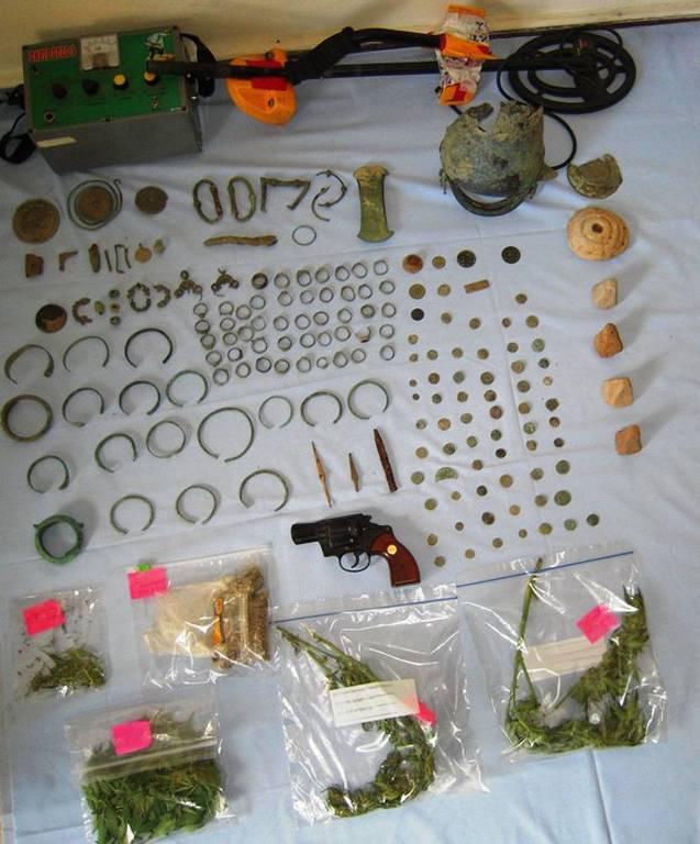 Πιο αναλυτικά, σύμφωνα με ανακοίνωση της Αστυνομίας, κατασχέθηκαν τα εξής: ένας χάλκινος σταμνοειδής κάδος (ελλιπής κατά το σώμα), ένας ακέραιος χάλκινος διπλούς πέλεκυς, πέντε πήλινες αγνύθες, τρία τμήματα από χάλκινες οκτώσχημες πόρπες, 58 χάλκινα και δυο ασημένια νομίσματα, 52 χάλκινα δακτυλίδια, 18 ακέραια χάλκινα ψέλια και τέσσερα ελλιπή, δύο χάλκινοι κρίκοι, δύο σιδερένιες αιχμές βελών, τμήμα σιδερένιου καρφιού, οκτώ χάλκινες χάνδρες, τμήματα από τέσσερις χάλκινες πόρπες, τμήμα χάλκινης περόνης, μία χάλκινη εφυλίδα, τέσσερις χάλκινες λαβές αγγείων, δύο χάλκινα κοσμήματα, τρία μολύβδινα εξαρτήματα και δώδεκα χάλκινα ελάσματα.