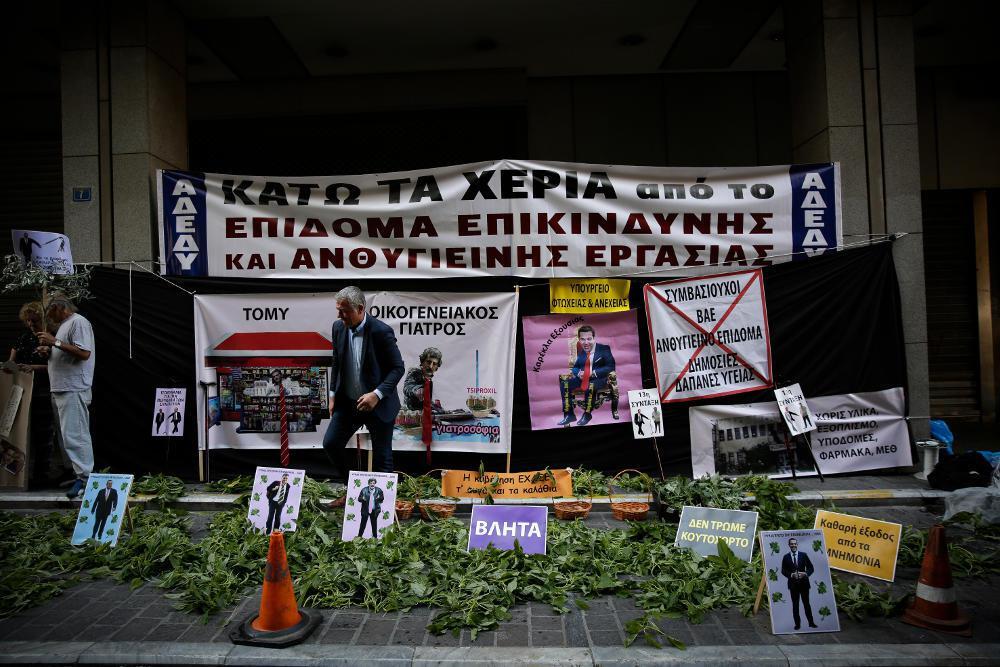 Οι εργαζόμενοι στα δημόσια νοσοκομεία διαμαρτύρονται έχουν υψώσει πανό έξω από το υπουργείο, όπου μεταξύ άλλων, απεικονίζεται ο αναπληρωτής υπουργός Υγείας να φτιάχνει γιατροσόφια «Τσιπροξιλ», γέμισαν την άσφαλτο με βλήτα και συνθήματα όπως «Η κυβέρνηση έχει χάσει τα έχασε τ’ αυγά και τα καλάθια».