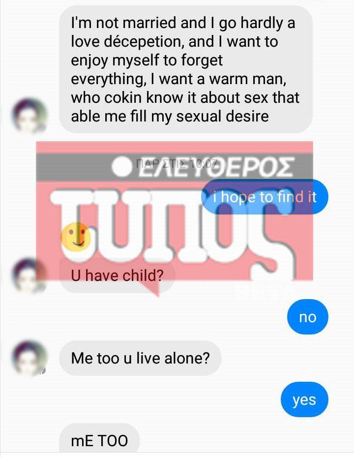 Στο τελευταίο κομμάτι της συνομιλίας που δημοσιεύει ο eleftherostypos.gr βλέπουμε πως η κοπέλα στέλνει στον ανυποψίαστο (μέχρι εκείνη την στιγμή) χρήστη, γυμνές της φωτογραφίες και τον προτρέπει να συνομιλήσουν μέσω βιντεοκλήσης και συγκεκριμένα μέσω skype με σκοπό ο άνδρας να προβεί σε σεξουαλικές πράξεις τις οποίες θα τις καταγράψουν σε βίντεο και να τον εκβιάσουν.