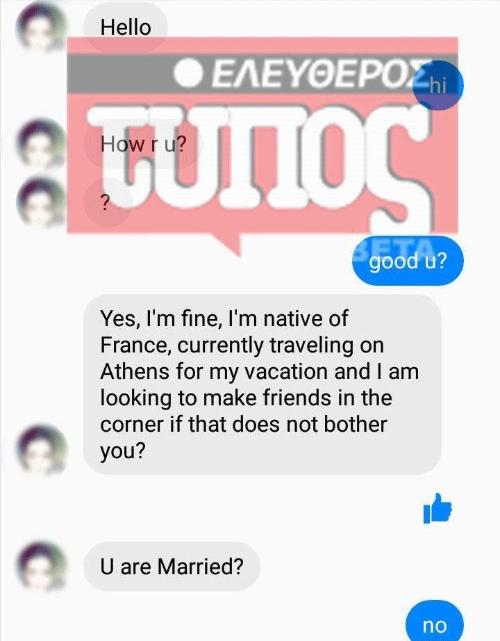 Η αρχή της συνομιλίας με τον ανυποψίαστο χρήστη. Του εξηγεί πως είναι από την Γαλλία και πως έχει έρθει για διακοπές στην Ελλάδα και ψάχνει νέους φίλους. Αμέσως μετά τον ρωτάει αν είναι παντρεμένος.