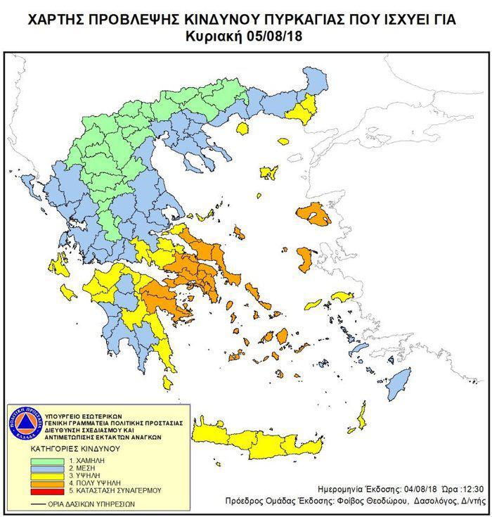 Σύμφωνα με το Χάρτη Πρόβλεψης Κινδύνου Πυρκαγιάς που εκδίδει η Γενική Γραμματεία Πολιτικής Προστασίας του υπουργείου Εσωτερικών (www.civilprotection.gr), για την Κυριακή 5 Αυγούστου, προβλέπεται πολύ υψηλός κίνδυνος πυρκαγιάς (κατηγορία κινδύνου 4) για τις εξής περιοχές: