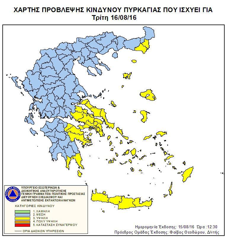 Σύμφωνα με το Χάρτη Πρόβλεψης Κινδύνου Πυρκαγιάς που εκδίδει η Γενική Γραμματεία Πολιτικής Προστασίας του Υπουργείου Εσωτερικών & Διοικητικής Ανασυγκρότησης, για σήμερα Τρίτη 16 Αυγούστου 2016, προβλέπεται πολύ υψηλός κίνδυνος πυρκαγιάς (κατηγορία κινδύνου 3) για τις παρακάτω περιοχές: