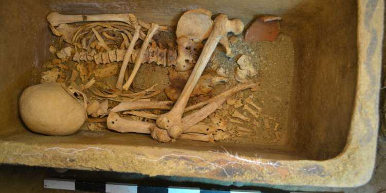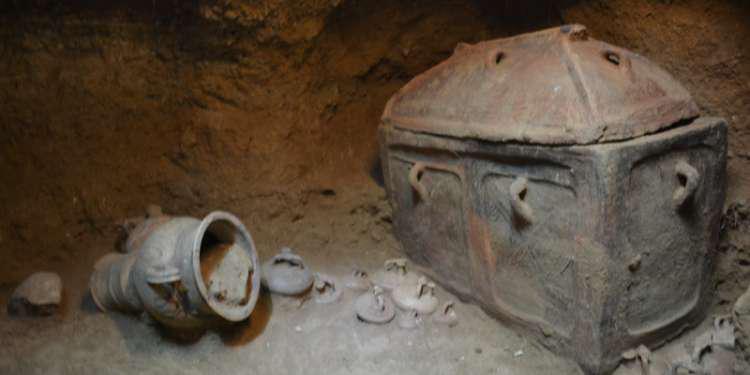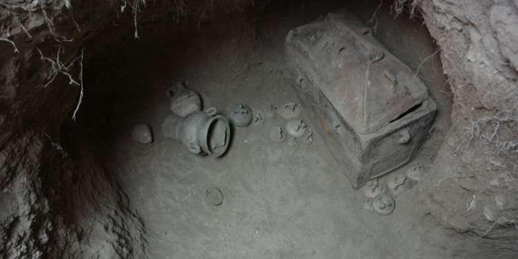 Σύμφωνα πάντα με το ΥΠΠΟΑ, το εσωτερικό του τάφου χωριζόταν σε τρείς λαξευμένες κόγχες. Στη νοτιότερη βρέθηκε μια ακέραιη κιβωτιόσχημη λάρνακα με το κάλυμμα στη θέση του. Στο εσωτερικό της υπήρχε ο πολύ καλά σωζόμενος σκελετός ενός ενήλικου ατόμου σε ισχυρά συνεσταλμένη στάση. Στον χώρο μπροστά από τη λάρνακα βρέθηκαν 14 ψευδόστομοι αμφορείς, ένας αμφοροειδής κρατήρας με συμφυές υποστατό και ένα κύπελλο.