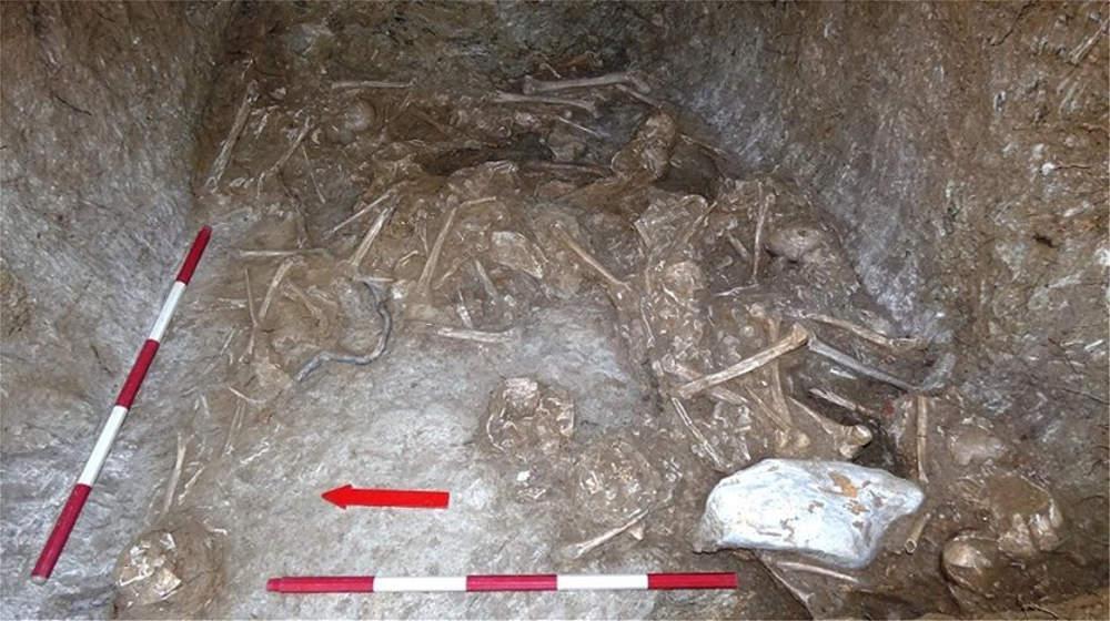 Β). Ασύλητος θαλαμοειδής τάφος της Υστεροελλαδικής ΙΙΙΒ-Γ εποχής (1300-1100 π.Χ.) με διάμετρο θαλάμου 2,40 μ. και μήκος δρόμου 7,50 μ. Περιείχε 11 ταφές σε ανακομιδή και μία κατά χώραν. Στο εσωτερικό του εντοπίστηκαν 6 ακέραια και τουλάχιστον άλλα 7 θραυσμένα αγγεία, κυρίως ψευδόστομοι αμφορίσκοι, αλάβαστρα, πρόχους και κύπελλο, χάλκινη πόρπη, 53 σφονδύλια από στεατίτη, λίθινες χάντρες, περίτεχνα κομβία από ελεφαντόδοντο και τρεις εξαιρετικής καλλιτεχνικής αξίας σφραγιδόλιθοι. […].