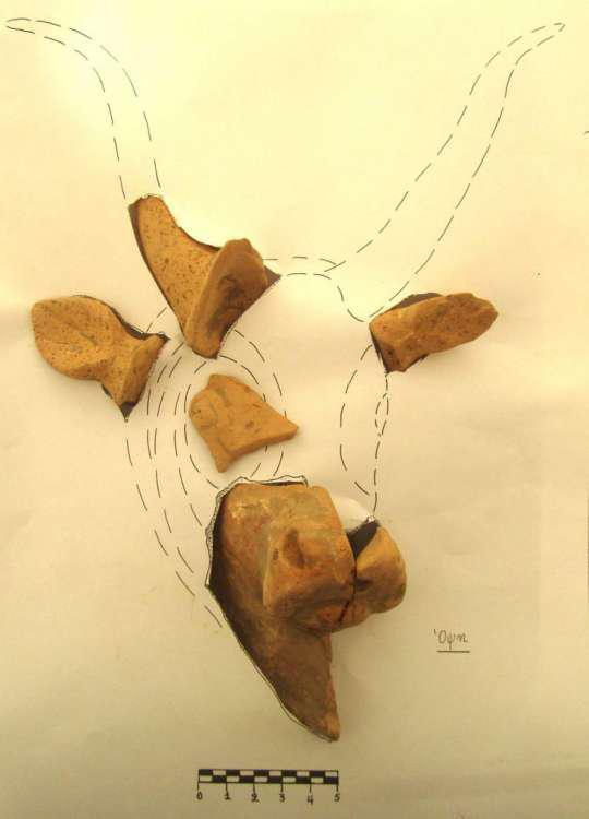 Ιδιαίτερο εύρημα, όμως, αποτελούν τμήματα μεγάλου ρυτού (τελετουργικό αγγείο) σε σχήμα ταυροκεφαλής ύψους 30 εκ., το οποίο εντοπίστηκε σε ένα από τα δωμάτια της δυτικής πλευράς του κτηρίου.