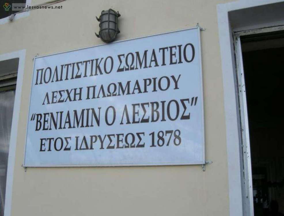 Η Λέσχη Πλωμαρίου «Βενιαμίν ο Λέσβιος», εδρεύει στο Πλωμάρι της Λέσβου από το 1878. Αποτελεί πολιτιστικό μορφωτικό σωματείο που φέρει το όνομα του σπουδαίου διαφωτιστή και αγωνιστή εθνοδιδασκάλου Βενιαμίν του Λεσβίου. Η Λέσχη διαθέτει βιβλιοθήκη 3.500 τόμων (με ψηφιοποιημένες 170.000 σελίδες από τα έντυπά της) και χειρόγραφο της Φυσικής του Βενιαμίν. Θέλοντας να αναδείξει την επιστημονική γνώση και τη φιλοσοφική σκέψη του Βενιαμίν, η Λέσχη προχώρησε στην ομοιογραφική αναπαραγωγή και την ψηφιακή καταχώρηση της χειρόγραφης “Φυσικής” του, καθώς και της χειρόγραφης βιογραφίας του από τον σχολάρχη Γ. Α. Αριστείδη-Πάππη. (Βλέπε: http://www.veniaminlesviossociety.gr/Αρχική/PID/597/CategoryID/8/CategoryName/Βιβλία ).