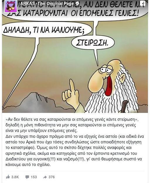 Δεν υπάρχει πιο άχαρο πράγμα από το να εξηγείς ένα αστείο (και ειδικά ένα αστείο του Αρκά που έχει τόσες συνδηλώσεις ώστε οποιαδήποτε εξήγηση το καταστρέφει). Όμως αυτό το σκίτσο δέχτηκε πολλές αναφορές και αρνητικά σχόλια, ακόμα και κατηγορίες από τον έρποντα κρετινισμό του Διαδικτύου για ευγονική(!!!) και ναζισμό(!!!), γι’ αυτό θεωρήσαμε σωστό να κάνουμε αυτό το σχόλιο.
