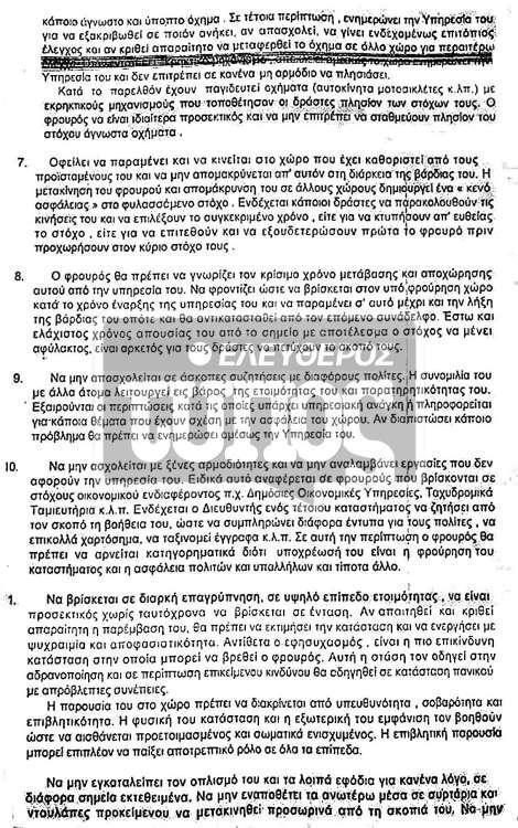1. Ο αστυνομικός προσέρχεται με οπλισμό, πυρομαχικά, αστυνομική ράβδο, χειροπέδες, φακό, βιβλιάριο σκοπού, σφυρίχτρα.