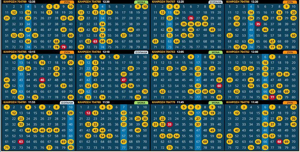Τέλος, αν οι είκοσι αριθμοί που κληρώθηκαν είναι μισοί ΜΟΝΟΙ και μισοί ΖΥΓΟΙ τότε κερδίζει η κατηγορία ΙΣΟΠΑΛΙΑ. Σε κάθε μία από τις εν λόγω κατηγορίες επιτυχιών αντιστοιχεί και ένας συντελεστής απόδοσης με βάση τους οποίους προκύπτει το κέρδος κάθε συμμετοχής. Η ελάχιστη συμμετοχή στον τύπο παιχνιδιού ΜΟΝΑ/ΖΥΓΑ είναι δύο στήλες, δηλαδή ένα ευρώ.