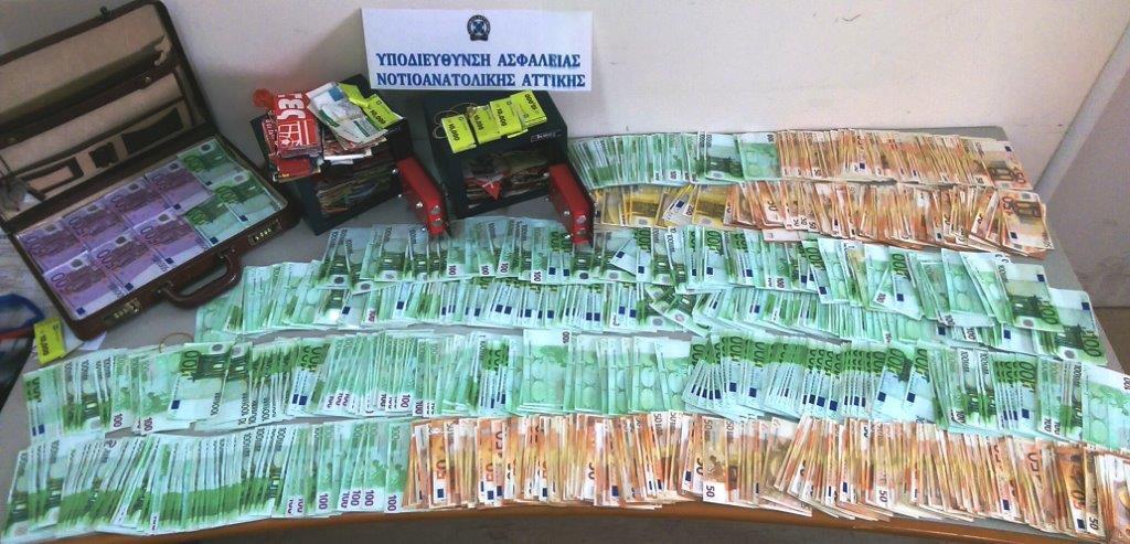 Στην κατοχή τους καθώς και από την κατ’ οίκον έρευνα, βρέθηκαν και κατασχέθηκαν το χρηματικό ποσό των -108.700- ευρώ, δύο (2) χρηματοκιβώτια, ένας (1) χαρτοφύλακας και πλήθος αποκομμάτων εφημερίδων σε δεσμίδες, σχήματος και μεγέθους χαρτονομισμάτων. Επίσης κατασχέθηκε και ένα (1) αυτοκίνητο ως μέσο μεταφοράς και δύο (2) κινητά τηλέφωνα.