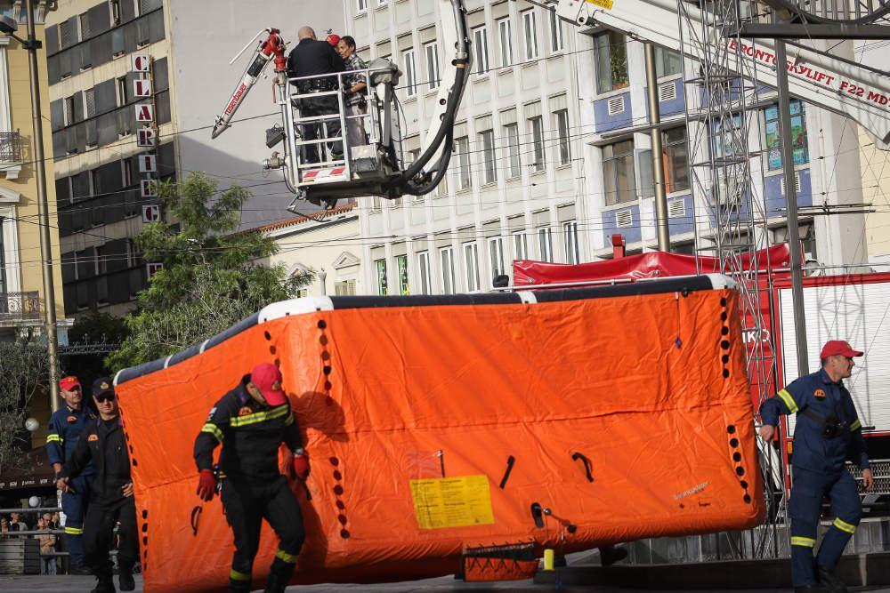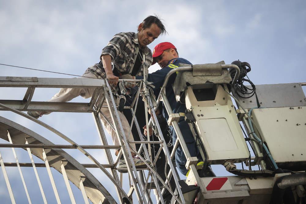 Η στιγμή που ο άνδρας πείθεται να κατέβει από το γλυπτό με τη συνδρομή των ανδρών και του γερανού της Πυροσβεστικής