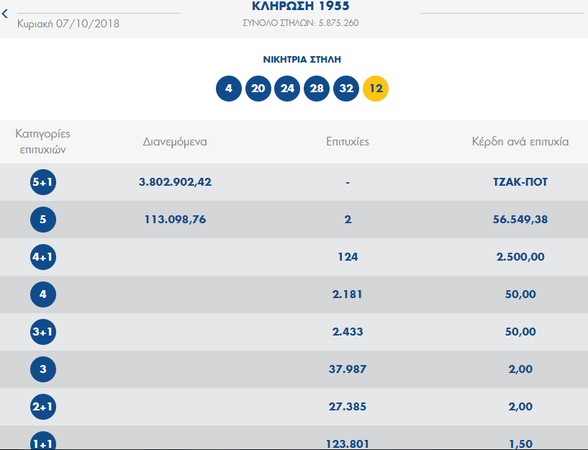 Οι αριθμοί που κληρώθηκαν το βράδυ της Κυριακής (07/10), ήταν οι: 4, 20, 24, 28, 32 και Τζόκερ ο αριθμός 12.