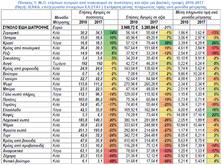Συγκεκριμένα, συνολικά καταγράφεται μία μείωση στην αξία των αγορών κατά 21%, ενώ η εκτίμηση για τη μείωση του όγκου-ποσότητας των αγορών είναι της τάξης του 15%. Αυτό αντικατοπτρίζεται από το γεγονός ότι 19 από τις 26 κατηγορίες τροφίμων που εξετάζει στην έρευνά το ΙΕΛΚΑ, παρουσιάζουν μείωση στην ποσότητα που αγοράστηκε το 2017 σε σχέση με το 2010, ενώ 20 από τις 26 κατηγορίες παρουσιάζουν μείωση στην αξία που αγοράστηκε το 2017 σε σχέση με το 2010.