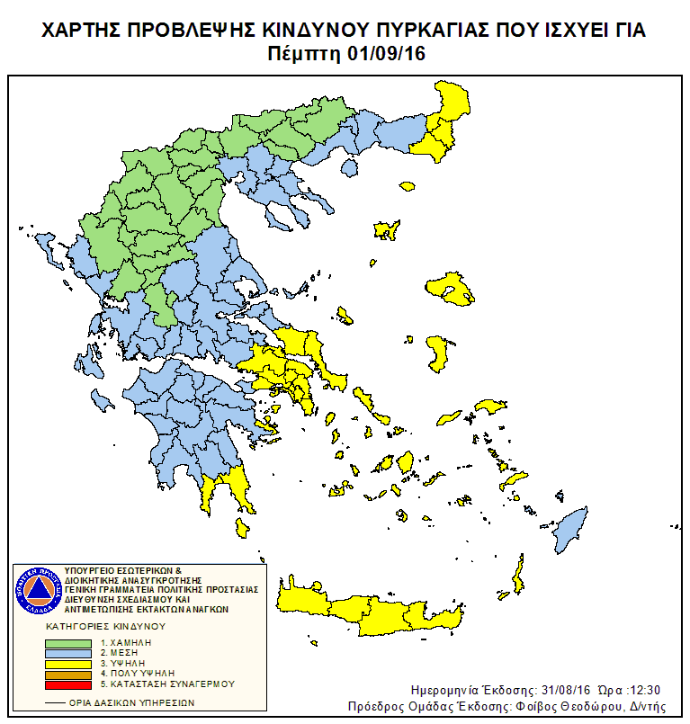 Σύμφωνα με το Χάρτη Πρόβλεψης Κινδύνου Πυρκαγιάς που εκδίδει η Γενική Γραμματεία Πολιτικής Προστασίας του Υπουργείου Εσωτερικών & Διοικητικής Ανασυγκρότησης, για σήμερα Πέμπτη 1 Σεπτεμβρίου 2016, προβλέπεται πολύ υψηλός κίνδυνος πυρκαγιάς (κατηγορία κινδύνου 3) για τις παρακάτω περιοχές: