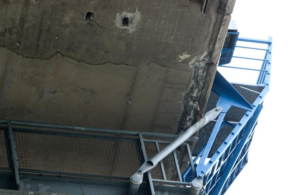 Σε αρκετά σημεία του, το «κατάστρωμα» της Υψηλής Γέφυρας έχει υποστεί εμφανείς φθορές, ενώ μικρά τμήματα του τσιμεντένιου φλοιού έχουν αποκολληθεί, πέφτοντας στη θάλασσα.