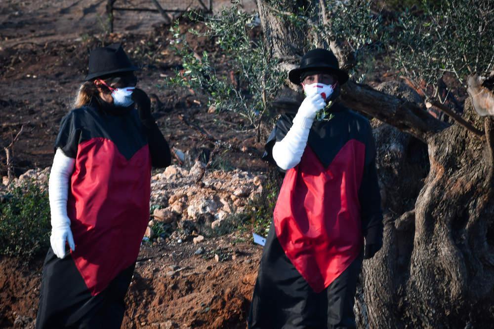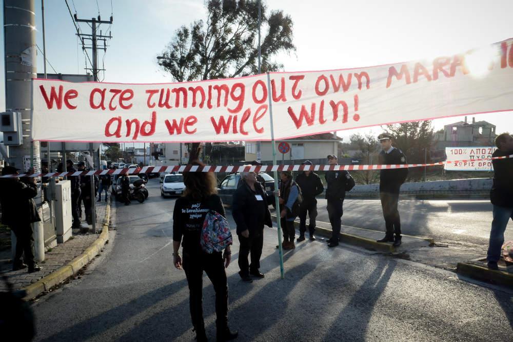 Σε σημείο από το οποίο περνούσαν οι μετέχοντες στη μαραθώνια διαδρομή, τοποθέτησαν πανό, ενώ τρία άτομα φορούσαν μαύρα, με μία μεγάλη κόκκινη καρδιά, μάσκες και κρατούσαν κλαδί ελιάς.