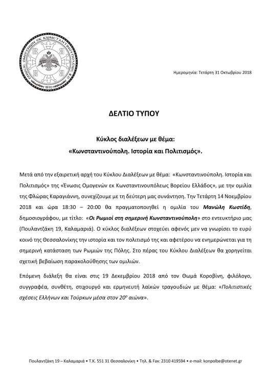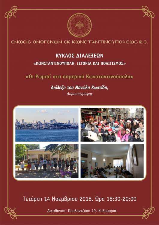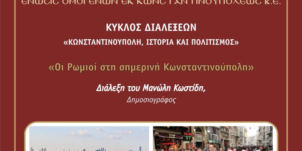 Εισηγητής θα είναι ο Μανώλης Κωστίδης, δημοσιογράφος και το θέμα της διάλεξης του θα είναι «Οι Ρωμιοί στη σημερινή Κωνσταντινούπολη».