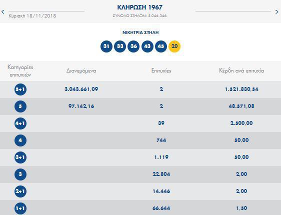 Υπενθυμίζεται ότι οι τυχεροί αριθμοί που έβγαλε η κλήρωση της Κυριακής (18/11) ήταν οι: 31, 33, 36, 43, 45 και Τζόκερ ο αριθμός 20.