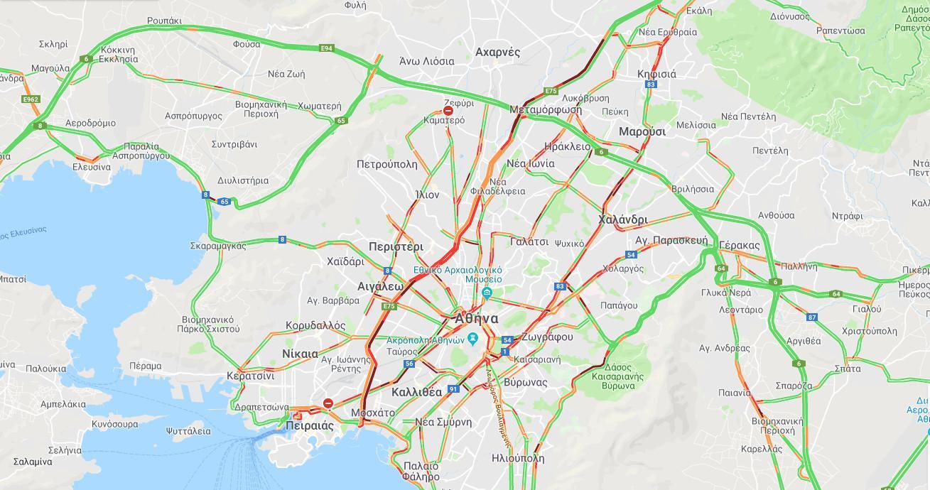 Όπως θα δείτε και στον παρακάτω χάρτη, έντονη κίνηση παρατηρείται στην εθνική οδό από την έξοδο της Κηφισιάς έως τον Κόκκινο Μύλο, στο ρεύμα προς Αθήνα, ενώ αυξημένη κίνηση υπάρχει στο ύψος του Φαλήρου μέχρι την έξοδο των Αχαρνών στο ρεύμα προς Λαμία .