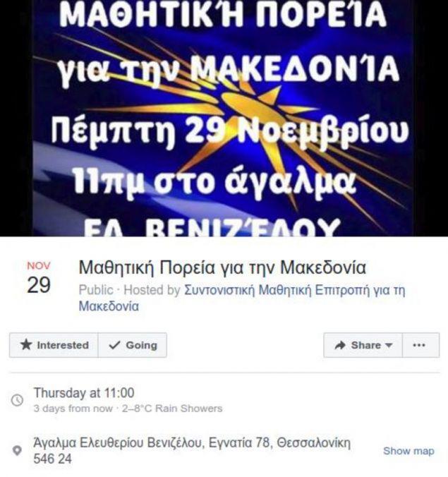 Την ίδια στιγμή, μια ομάδα στο Facebook που υπογράφει ως «Συντονιστική Μαθητική Επιτροπή για τη Μακεδονία» απευθύνει κάλεσμα για πραγματοποίηση πορείας, επίσης, στις 29 Νοεμβρίου.