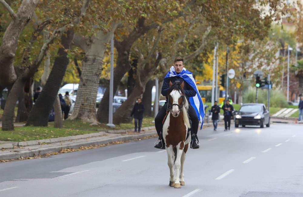 Ξεχωριστή εικόνα στη συγκέντρωση ένας μαθητής από το 1ο ΕΠΑΛ Ευόσμου που κατέβηκε στους δρόμους με το άλογό του μαζί με άλλους μαθητές από σχολεία της δυτικής Θεσσαλονίκης.