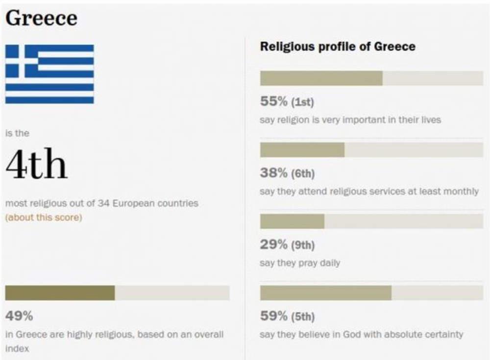 Η Ελλάδα πάντως βρίσκεται στην πρώτη θέση στην υποκατηγορία της «σημασίας της θρησκείας», καθώς το 55% των ερωτηθέντων δήλωσε ότι η θρησκεία διαδραματίζει καίριο ρόλο στις ζωές τους.