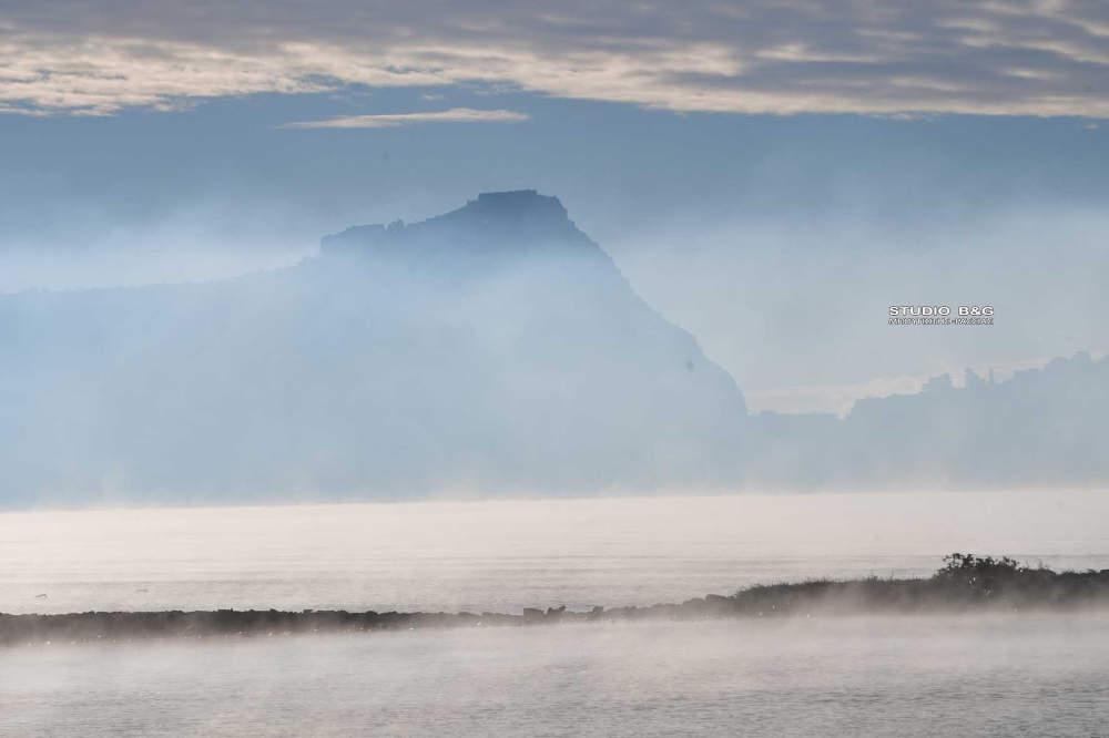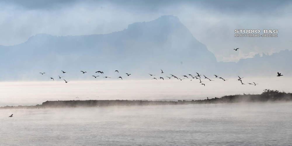 Η εικόνα που δημιουργήθηκε στον Αργολικό κόλπο νωρίς το πρωί της Τετάρτης με τα χιονισμένα γύρω βουνά ήταν εντυπωσιακή καθώς η θάλασσα άχνιζε, δημιουργώντας την εντύπωση πως «βράζει».