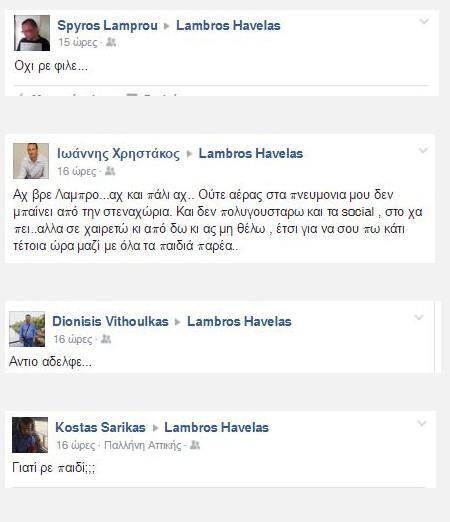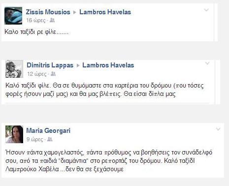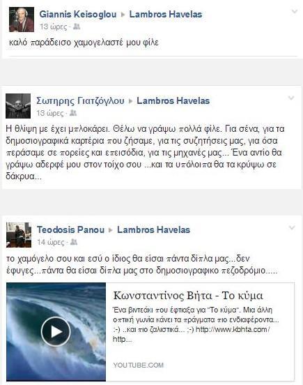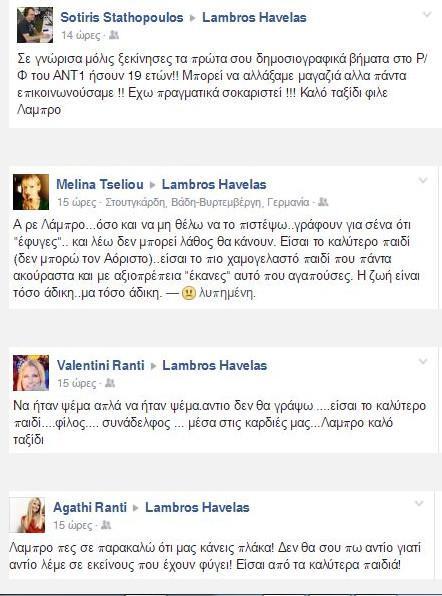 «Να ήταν ψέμα απλά να ήταν ψέμα. αντιο δεν θα γράψω ….είσαι το καλύτερο παιδί….φίλος…. συνάδελφος … μέσα στις καρδιές μας…Λαμπρο καλό ταξίδι», «Ήσουν πάντα χαμογελαστός, πάντα πρόθυμος να βοηθήσεις τον συνάδελφό σου, από τα παιδιά “διαμάντια” στο ρεπορτάζ του δρόμου. Καλό ταξίδι Λαμπρούκο Χαβέλα …δεν θα σε ξεχάσουμε» γράφουν συγκινημένοι οι δημοσιογράφοι-φίλοι του Λάμπρου Χαβέλα.