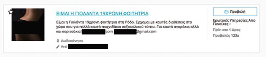 Η «δημοκρατική» είχε αναφερθεί συγκεκριμένα στην 19χρονη Γιολάντα, φοιτήτρια, που διαφήμιζε την παροχή ερωτικών υπηρεσιών στην Ρόδο μέσω του διαδικτύου, τάζοντας στους υποψήφιους πελάτες της ερωτικές υπηρεσίες μέσα από μικρή αγγελία αλλά και από προσωπική της ιστοσελίδα, που παρέχει τη δυνατότητα για περισσότερες πληροφορίες ως και φωτογραφικό υλικό, αν γίνεις μέλος κοινότητας, αλλά και για την 21χρονη Εμμα, που ακολούθησε.
