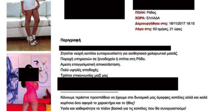 Από τα μέσα του Οκτωβρίου 2017, έκανε την εμφάνισή της στο διαδίκτυο, αγγελία εταιρείας, που φέρεται να λειτουργεί στην Κρήτη, με την επωνυμία cretegirlsnetwork και με κινητό τηλέφωνο επικοινωνίας, με την οποία ζητείται προς πρόσληση «νεαρή κοπέλα ευπαρουσίαστη για αισθησιακό-χαλαρωτικό μασάζ» για παροχή υπηρεσιών σε ξενοδοχεία ή σπίτια στη Ρόδο.