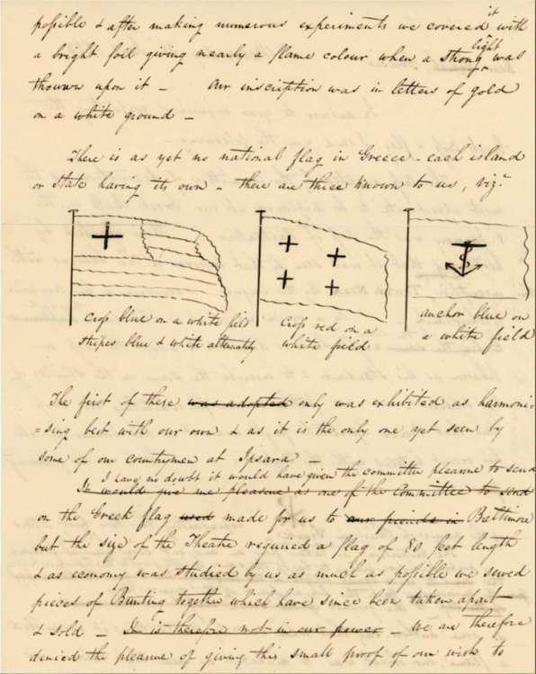 Το ημερολόγιο δείχνει 28 Ιανουαρίου του 1824 και στη Νέα Υόρκη ο Αμερικανός φιλέλληνας, με τα αρχικά J.J.I., στέλνει μια επιστολή στη Βαλτιμόρη προς τον φίλο του, Gracie, όπου δίνει πληροφορίες για τα εμβλήματα και τους συμβολισμούς τού απελευθερωτικού αγώνα των Ελλήνων. Τότε, για πρώτη ίσως φορά, σχεδιάζεται επί χάρτου με σινική μελάνη η ελληνική σημαία, όπως επισημαίνει μιλώντας στο ΑΠΕ-ΜΠΕ ο συλλέκτης-διεθνής κριτής, Γιώργος Θωμαρέης.