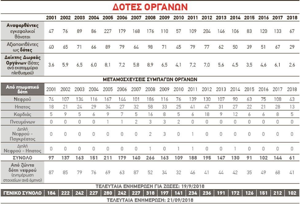 Η Ελλάδα φαίνεται πως δεν μπορεί να συναγωνιστεί άλλα κράτη στη δωρεά οργάνων, μιας και τα στοιχεία μαρτυρούν πως βρίσκεται ακόμα αρκετά πίσω. Σύμφωνα με τον Εθνικό Οργανισμό Μεταμοσχεύσεων, μέχρι τον Σεπτέμβριο του 2018, είχαν πραγματοποιηθεί 102 μεταμοσχεύσεις. Το 2017 ο αριθμός ήταν 212, ενώ το 2016 υπήρξε πτώση, καθώς έγιναν μόλις 151 μεταμοσχεύσεις. Το έτος που η χώρα τα πήγε καλά ήταν το 2008, καθώς έγιναν 318 μεταμοσχεύσεις και ήταν μάλιστα οι περισσότερες που έχουν πραγματοποιηθεί από το 2001 μέχρι σήμερα.