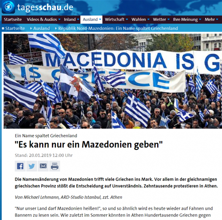 Τo γερμανικό δίκτυο «Tagesschau», αναφέρει μεταξύ άλλων:«Μόνο μία «Μακεδονία» υπάρχει… Η αλλαγή του ονόματος της πΓΔΜ σε «βόρεια Μακεδονία» διχάζει πολλούς Έλληνες. Δεκάδες χιλιάδες άτομα διαμαρτύρονται στο Σύνταγμα. Μόνο η χώρα μας μπορεί να αποκαλείται Μακεδονία!» Αυτό διαβάζουμε σήμερα σε σημαίες και πανό που κραδαίνουν οι διαδηλωτές που έχουν κατακλύσει τους δρόμους της Αθήνας. Μόνο η χώρα μας μπορεί να αποκαλείται Μακεδονία!»».