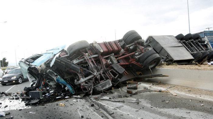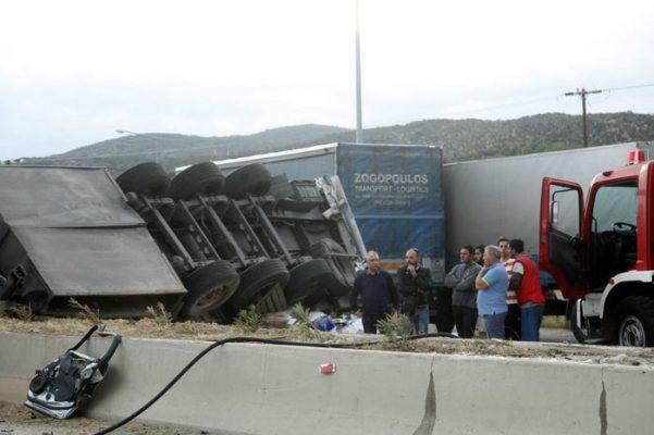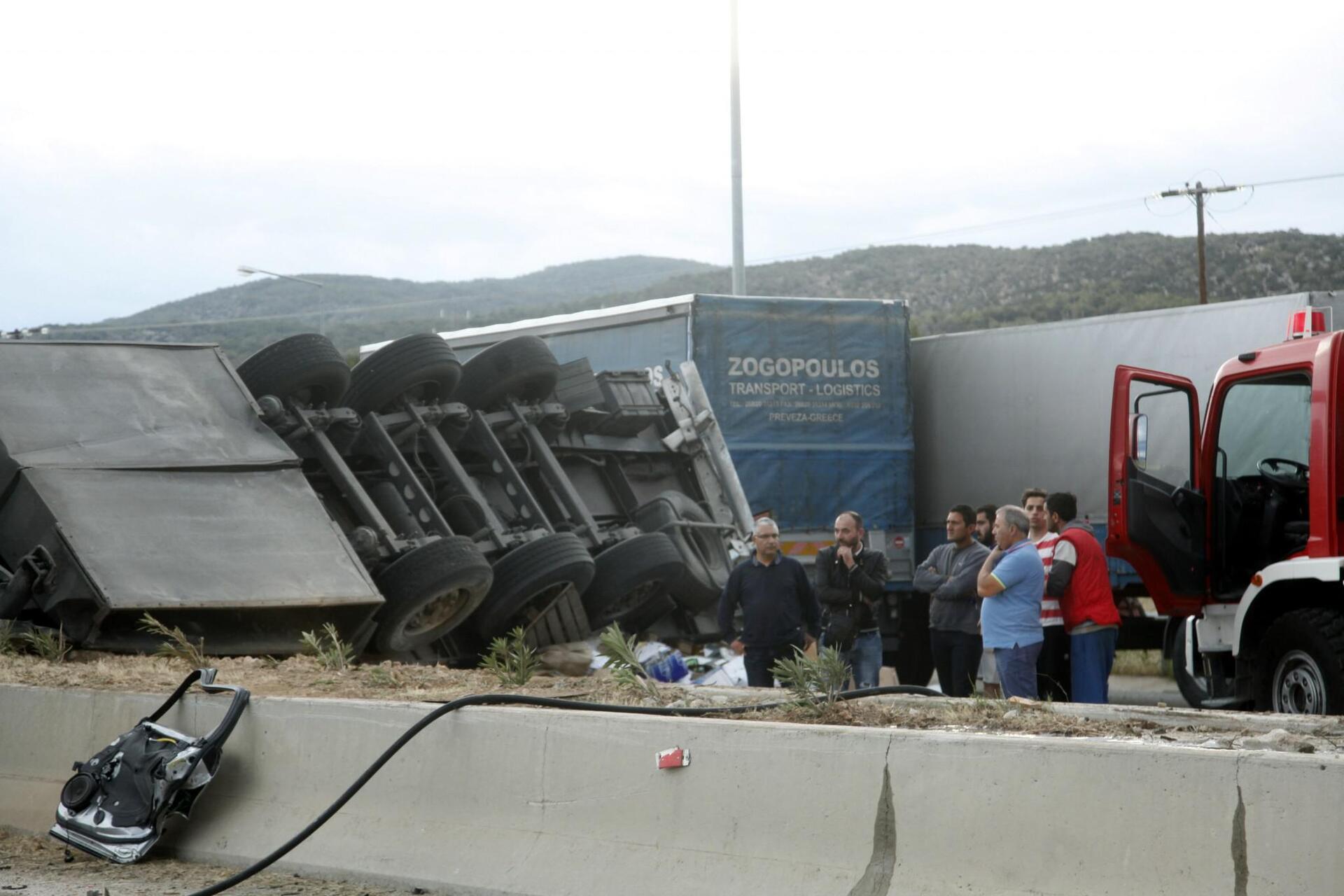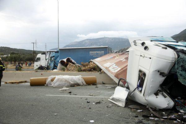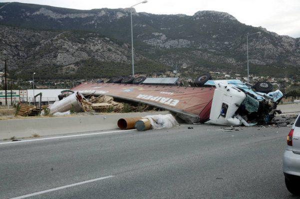 Σύμφωνα μαρτυρίες ατόμων νταλίκα που κινούνταν από Κόρινθο προς Αθήνα δίπλωσε και το επικαθήμενο πέρασε στο αντίθετο ρεύμα, αφού ανέβηκε πάνω από το στηθαίο. Στο φορτηγό έπεσαν δυο άλλες νταλίκες.