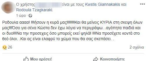 «Δεν το χωράει ο νους μου, δεν το χωράει. Ήλπιζα μέχρι την τελευταία στιγμή. Είχα τα θάρρητα μου στο Θεό και τα θαύματα. Δε μπορώ να το πιστέψω, ούτε θέλω. Αδιανόητο αυτό που συμβαίνει. Αυτή η τραγωδία για τόσο μικρούς ανθρώπους που χαθήκατε… Για τη μικρούλα που αφήσατε εδώ… Για τους γονείς που χάσανε τον μοναχογιό τους… Για την οικογένεια που έμεινε μόνο μία αδερφή πίσω… Δεν ξέρω για τι να πρωτοκλάψω… Κωστή και Ροδούλα μαζί στη ζωή, και στο θάνατο», λέει συγκλονισμένη μία φίλη του ζευγαριού.