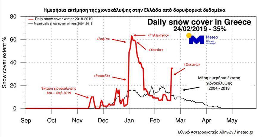 Εκτός από τις καταρρακτώδεις βροχοπτώσεις, πυκνές χιονοπτώσεις σημειώθηκαν το Σάββατο 23/02 ακόμη και σε πεδινές περιοχές της Βόρειας και Κεντρικής Ελλάδας, αυξάνοντας απότομα την έκταση χιονοκάλυψης που μέχρι τότε η πορεία της κινούνταν λίγο κάτω από τον μέσο όρο των τελευταίων 16 ετών για τον μήνα Φεβρουάριο.