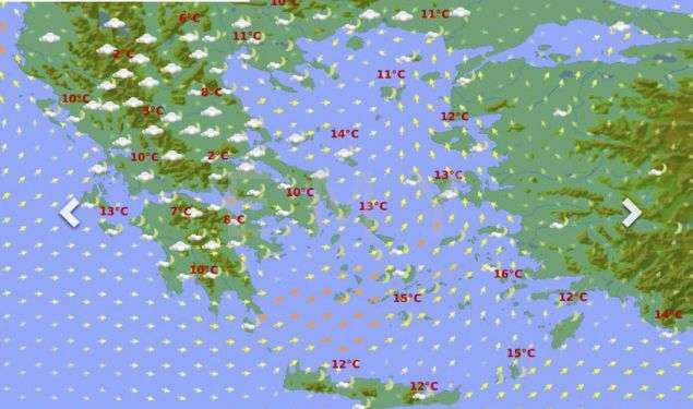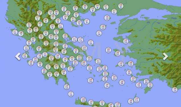 Θερμοκρασία: Από 08 έως 18 βαθμούς Κέλσιου. Στην Ηπειρο η ελάχιστη κατά τόπους 3-5 βαθμούς χαμηλότερη.