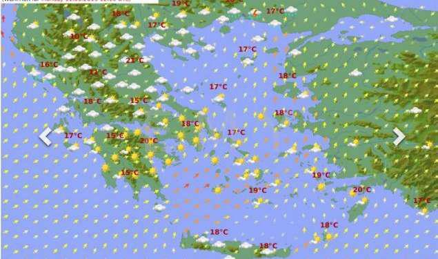 Ανεμοι: Στα νησιά ανατολικού Αιγαίου, νοτίων διευθύνσεων 4-5 και βαθμιαία τοπικά 6 μποφόρ. Στα Δωδεκάνησα μεταβλητοί 3-4 μποφόρ.