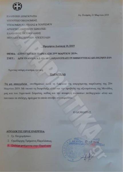 Το ανορθόγραφο έγγραφο (η απαγγελία έγινε απαγγελεία), καλεί τους ΟΥΚάδες να μην απαγγείλουν συνθήματα στην παρέλαση προς «αποφυγή κυρώσεων, πειθαρχικών αλλά και ποινικών σε στελέχη»!