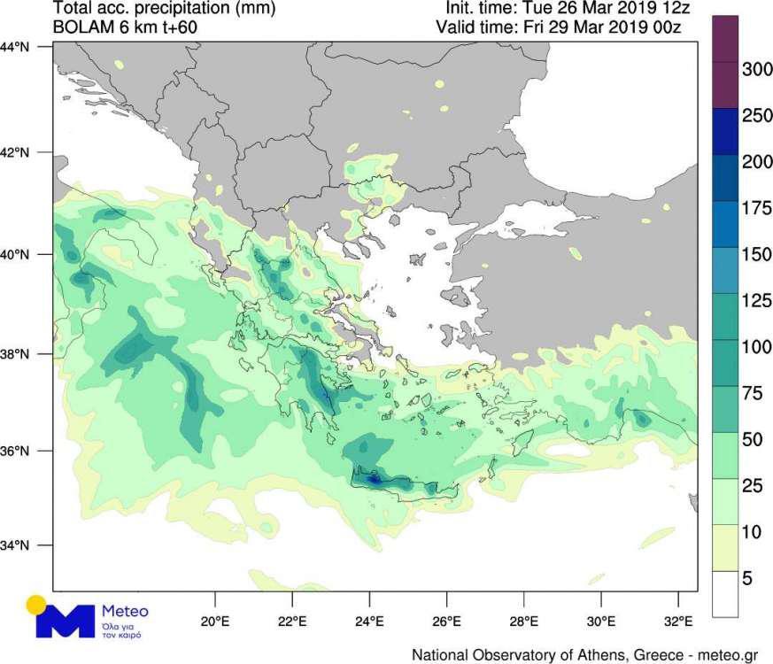 Στον προγνωστικό χάρτη που ακολουθεί παρουσιάζονται τα εκτιμώμενα αθροιστικά ύψη βροχόπτωσης το διήμερο Τετάρτη 27/03/2019 και Πέμπτη 28/03/2019. Όπως φαίνεται τα εντονότερα φαινόμενα θα εντοπίζονται κυρίως στα κεντρικά και νότια τμήματα της χώρας, συμπεριλαμβανομένης εκ νέου της Κρήτης. Χιονοπτώσεις θα εκδηλωθούν στα ορεινά ηπειρωτικά.