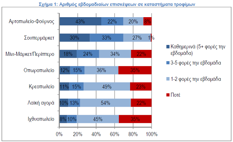Σίγουρα, το σημείο πώλησης που επισκέπτονται όλοι οι καταναλωτές είναι το σουπερμάρκετ, με μόλις το 1% να δηλώνει ότι δεν επισκέπτεται ποτέ κάποιο σουπερμάρκετ. Όπως φαίνεται όμως στο σχήμα 1 ο μέσος καταναλωτής: