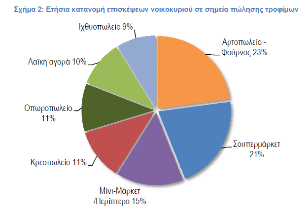 Χαρακτηριστικό είναι ότι όπως φαίνεται στο σχήμα 2, η κατανομή των επισκέψεων είναι ιδιαίτερα κατακερματισμένη, με το σουπερμάρκετ να έχει το 21% (το οποίο «σπάει» περεταίρω σε διαφορετικά καταστήματα), ο φούρνος το 23%, η λαϊκή αγορά το 10% και το εξειδικευμένο κατάστημα το κρεοπωλείο, ιχθυοπωλείο, οπωροπωλείο περίπου επίσης το 10%. Σημειώνεται ότι σε αυτά τα σημεία πώλησης δεν περιλαμβάνεται το κανάλι του διαδικτύου, το οποίο μπορεί ακόμα στην Ελλάδα να έχει χαμηλά ποσοστά πωλήσεων, αλλά στο εξωτερικό αποτελεί το κανάλι πώλησης με τους μεγαλύτερους ρυθμούς ανάπτυξης.
