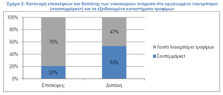 Όπως φαίνεται και στο σχήμα 3, μπορεί οι αλυσίδες σουπερμάρκετ να έχουν περίπου το 21% της επισκεψιμότητας στις αγορές τροφίμων, αλλά επίσης έχουν περίπου το 53% της συνολική δαπάνης των νοικοκυριών, κάτι το οποίο αντικατοπτρίζει αφενός το σημαντικά μεγαλύτερο μέσο καλάθι στις αγορές από το Σουπερμάρκετ συγκριτικά με τα υπόλοιπα σημεία πώλησης, αφετέρου την προτίμηση του καταναλωτικού κοινού για την πραγματοποίηση του μεγαλύτερου όγκου των αγορών στο δίκτυο της οργανωμένης λιανικής.