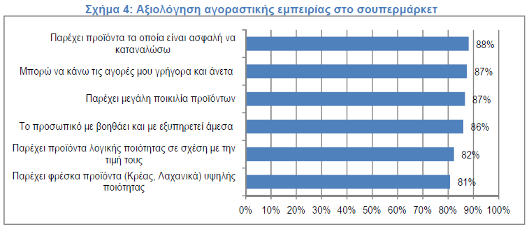 Όπως φαίνεται και στο σχήμα 4, ο Έλληνας καταναλωτής αξιολογεί πολύ υψηλά την αγοραστική εμπειρία στα σουπερμάρκετ σε ποσοστά άνω του 80%. Η ασφάλεια των αγορών είναι το πιο δυνατό σημείο, ενώ ακολουθούν η άνεση των αγορών, η ποικιλία και εξυπηρέτηση. Η σχέση ποιότητας-τιμής που είναι το κύριο ζητούμενο στη διαδικασία λήψης απόφασης σημείου πώλησης επίσης αξιολογείται θετικά από το 82% του κοινού.
