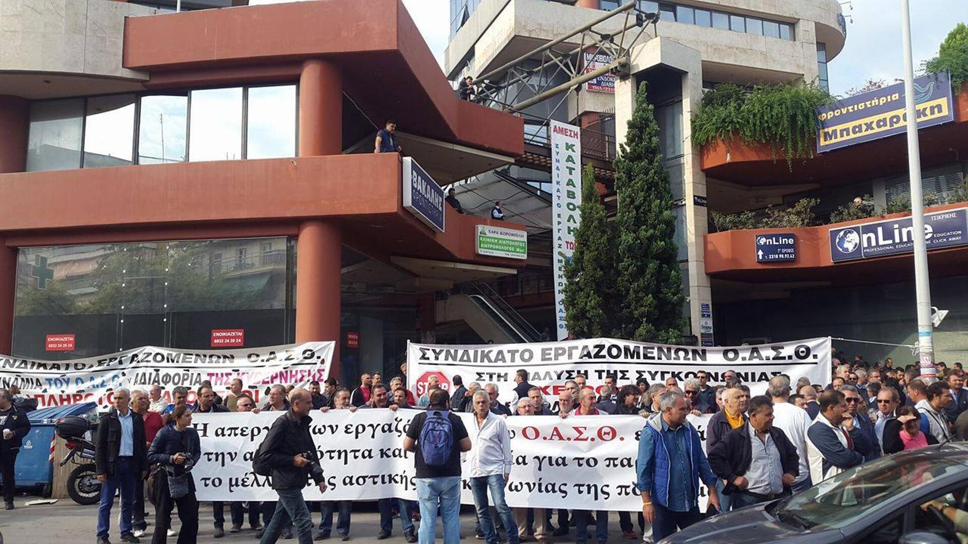 Oι εργαζόμενοι στον ΟΑΣΘ, οι οποίοι συνεχίζουν για ενδέκατη ημέρα την επίσχεση εργασίας τους πραγματοποίησαν διαμαρτυρία έξω από τα γραφεία του ΣΥΡΙΖΑ.